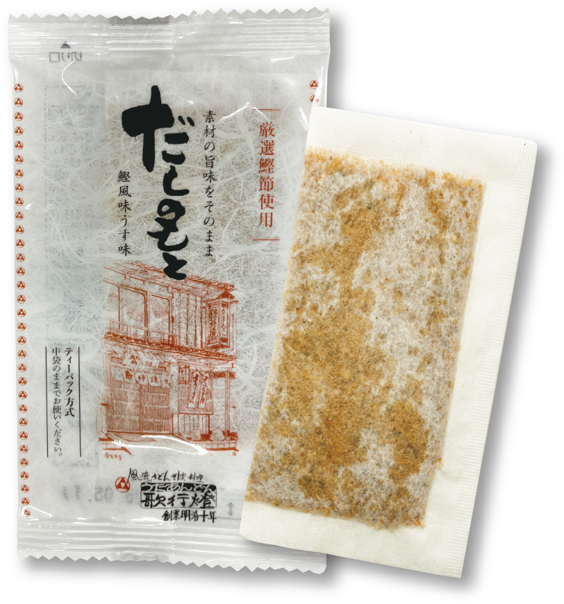 歌行燈秘伝の出汁をご家庭で使いやすくだしパックにしました。鍋やうどんはもちろん、煮物やみそ汁の下味にまで幅広くご利用頂けます。1983年の発売以来、3800万食以上を皆様のご家庭にお届けしております。普段使いにもご贈答用にもご利用頂けるよう、様々な包装にて御用視させて頂いております。